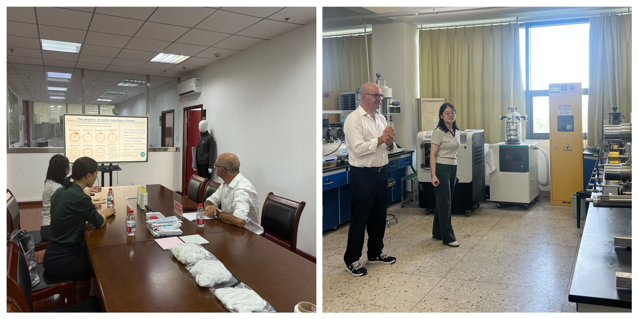 随后,António Braz Costa参观了国家地方联合工程实验室,并聚焦可持续发展与废旧纺织品循环再生技术,与365官网王金凤团队展开了深入交流与探讨。双方一致认为,通过校企合作与信息共享推进先进技术研究,将有效提升废旧纺织品资源化利用率,并就具体研究方向、人员互访计划和项目落地可行性等细节进行沟通,明确未来合作路径与工作重点。