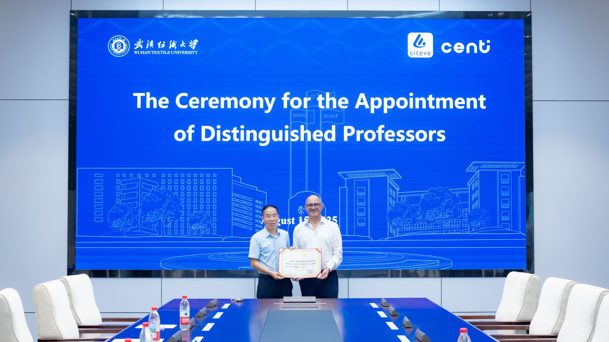 徐卫林对António Braz Costa在推动双方开展交流合作进程中给予的大力支持表示衷心感谢,并为其颁发特聘教授证书。他表示,今朝纺大正行驶在高质量发展的快车道上,希望双方力争在国际联合科研中取得实质性研究成果,以此推动中葡两国学术交流与人才互通。